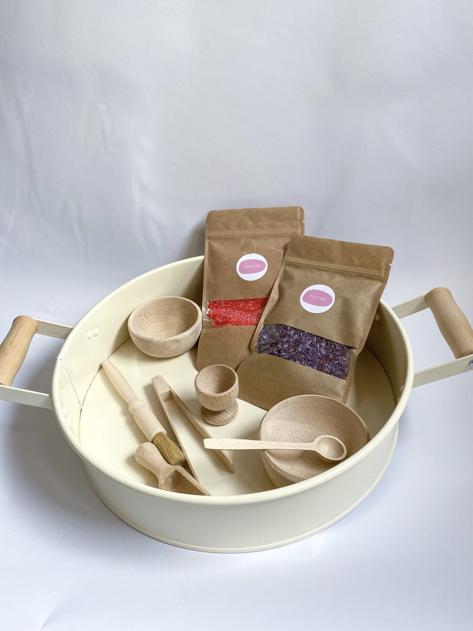 Przepiękny, zachęcający do sensorycznego szaleństwa i zabawy dziecięcy zestaw tacy z dodatkami. Dzięki zabawie manualnej, dziecko ćwiczy ruchy dłoni i paluszków.